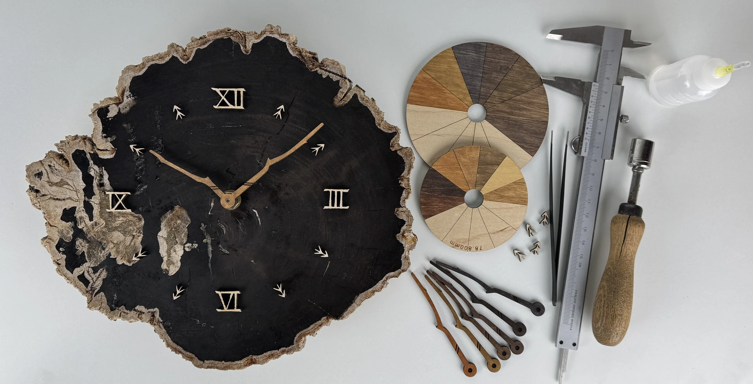 Jedes Stück ist ein Unikat. Die Raritäten werden in Handarbeit zu einzigartigen Blickfängen mit faszinierenden Maserungen und Strukturen verarbeitet. Die Ziffern und Zeiger der Uhren werden durch uns entworfen und aus Holz selbst gefertigt. Das Design wird für jede Uhr individuell und sorgfältig ausgewählt, sodass Material, Form und Proportionen ein stimmiges Gesamtbild ergeben. Abgerundet wird jede Arbeit durch ausgewählte Lasuren in erdigen Farbtönen.